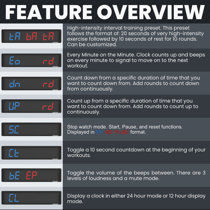 The Timer’s crystal-clear LED and high-contrast display allows you to see the bright red and blue numbers from all corners of your gym. The crisp “beeps” are at the ideal frequency for hearing when your AMRAP is up, even if you workout with music. We are positive that when you lock eyes with these bright, glaring numbers, you’ll work your butt off to get a few extra reps in before time is up!