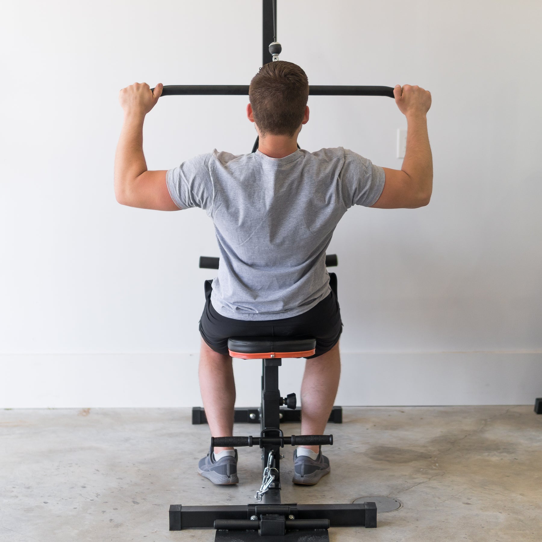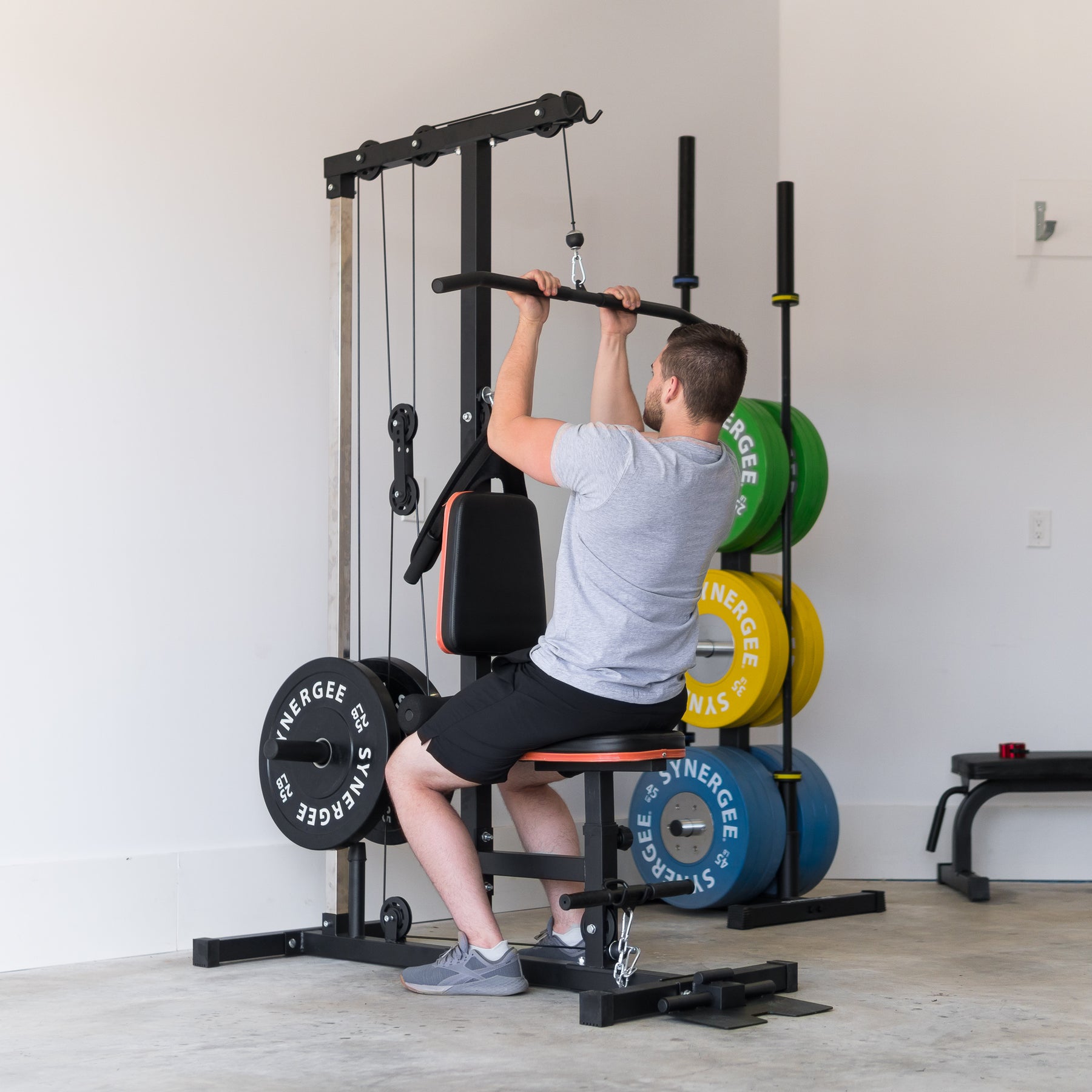 The Synergee Lat Pulldown Machine is a free-standing cable machine. It has 3 distinct zones for different workouts. The Top Exercise Zone provides a Lat Bar for pull-downs. Plus, a removable seat can be installed and quad rollers can be put to use if you want to perform them seated. The Mid Exercise Zone is the spot to perform weighted crunches, made extra comfortable by the padded harness with handles that’s included with the machine. The Lower Exercise Zone provides everything you need for standing rows, seated rows, curls and kick back. The handles provided with this machine are interchangeable, so you can set them at the height you need for your unique workout routines. Plus, the universal attachment points means any other cable workout handles can also be used on machine.