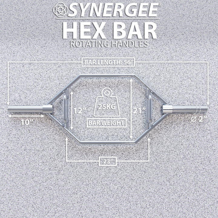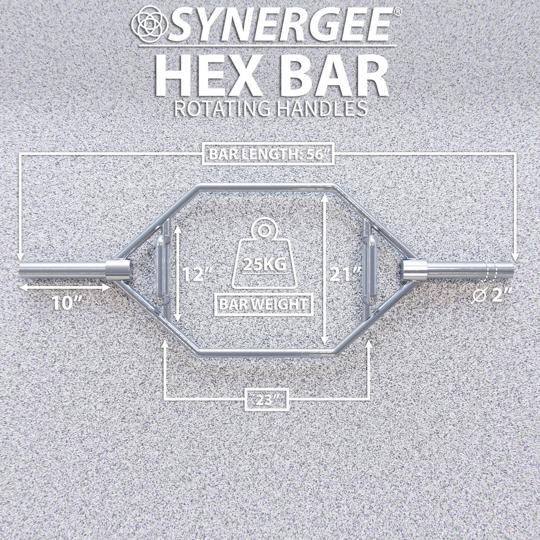 1. Our 25kg Hex Bar with rotating handles and 10” sleeves. Maximum load rating of 750lb.