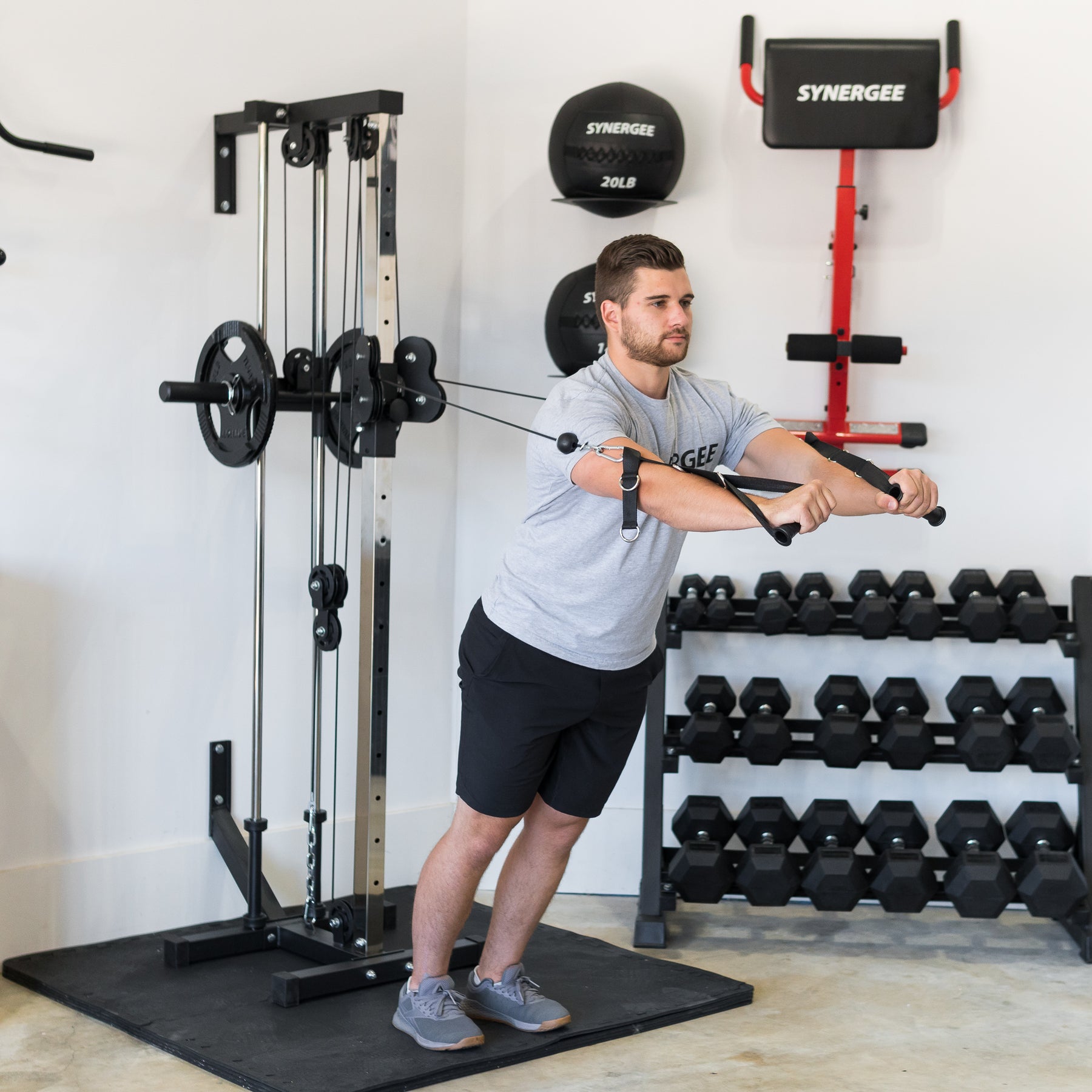 The Synergee Wall Mounted Adjustable Dual Pulley Machine has your home in mind. The machine is 79.2” high to accommodate most ceilings; and sits on a 28.2” by 30.9” base to provide the most exercises with the smallest footprint. Plus, the mounts are designed to accommodate baseboards, trim mouldings, and you can even store barbells or other gym equipment in the gap between your pulley machine and the wall behind it!